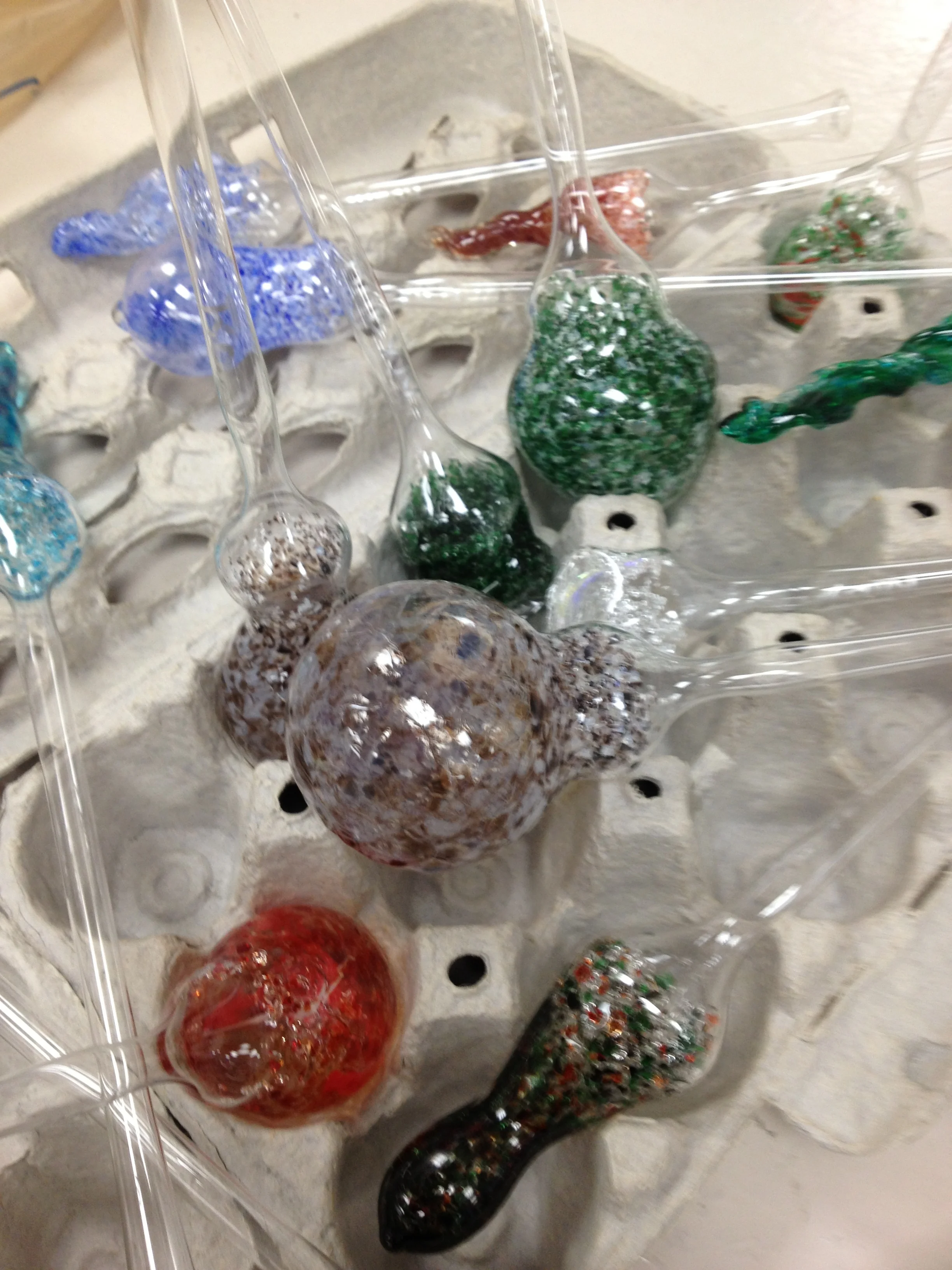 Join us for a hot fun evening as we blow unique heirloom ornaments. We will be using pre-blown clear glass cylinders with a blow pipe end, fill them with frit and stringers, and then heat them over a torch and blow. It is the same product used throughout Europe for making Christmas tree ornaments. With a little practice and patience you will be off to a running start for your holiday season.